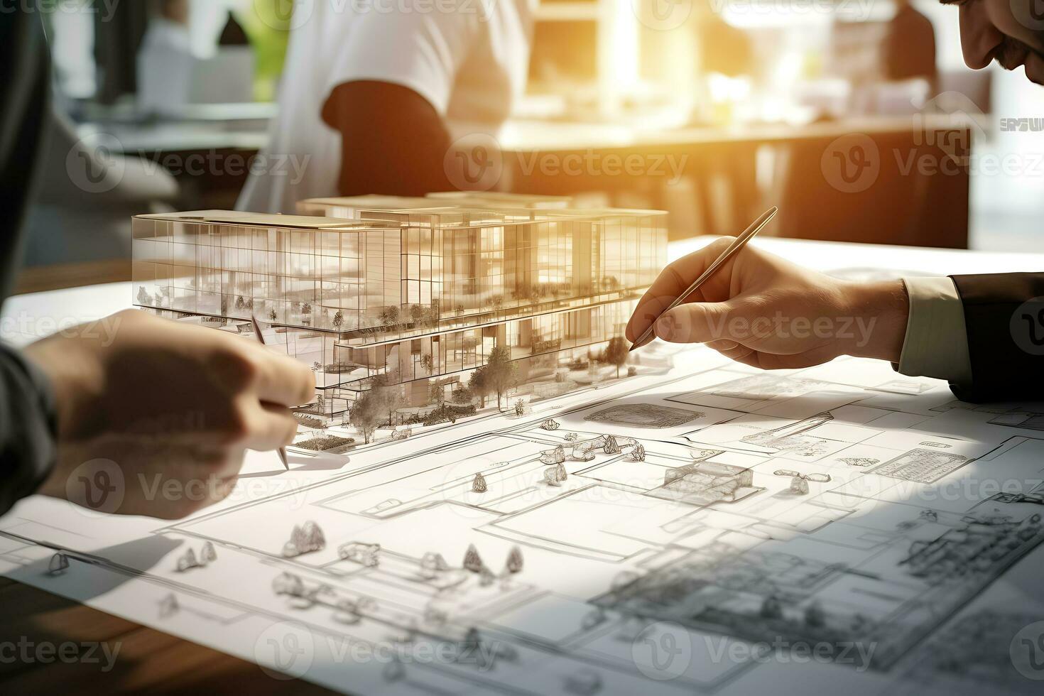 Architect working on blueprint at office. Architect and engineer concept AI Generated Pro Photo