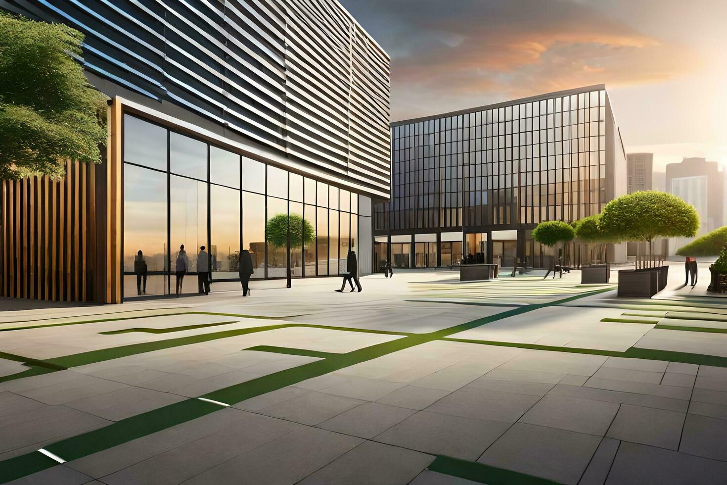 a rendering of a modern office building with trees and grass. AI-Generated Free Photo