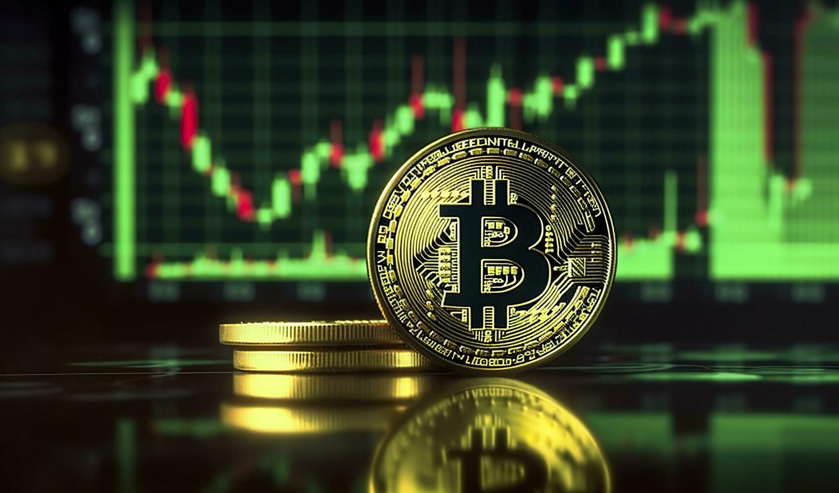 Bitcoin with green graph on computer screen background, Crypto currency trading. AI Generative Free Photo