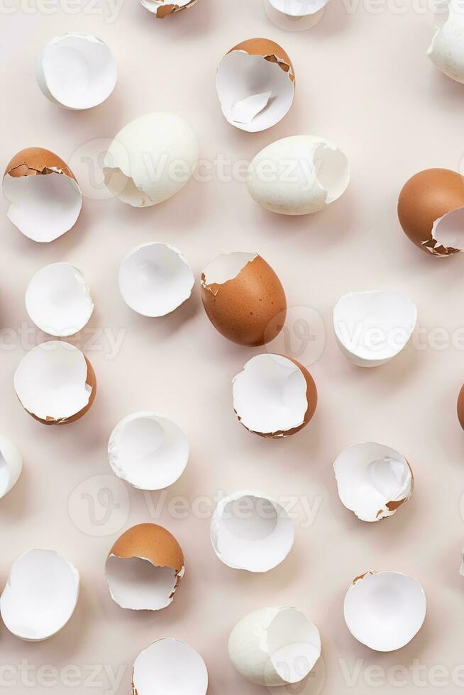 Springtime easter layout. Empty broken chicken eggshells. Pro Photo