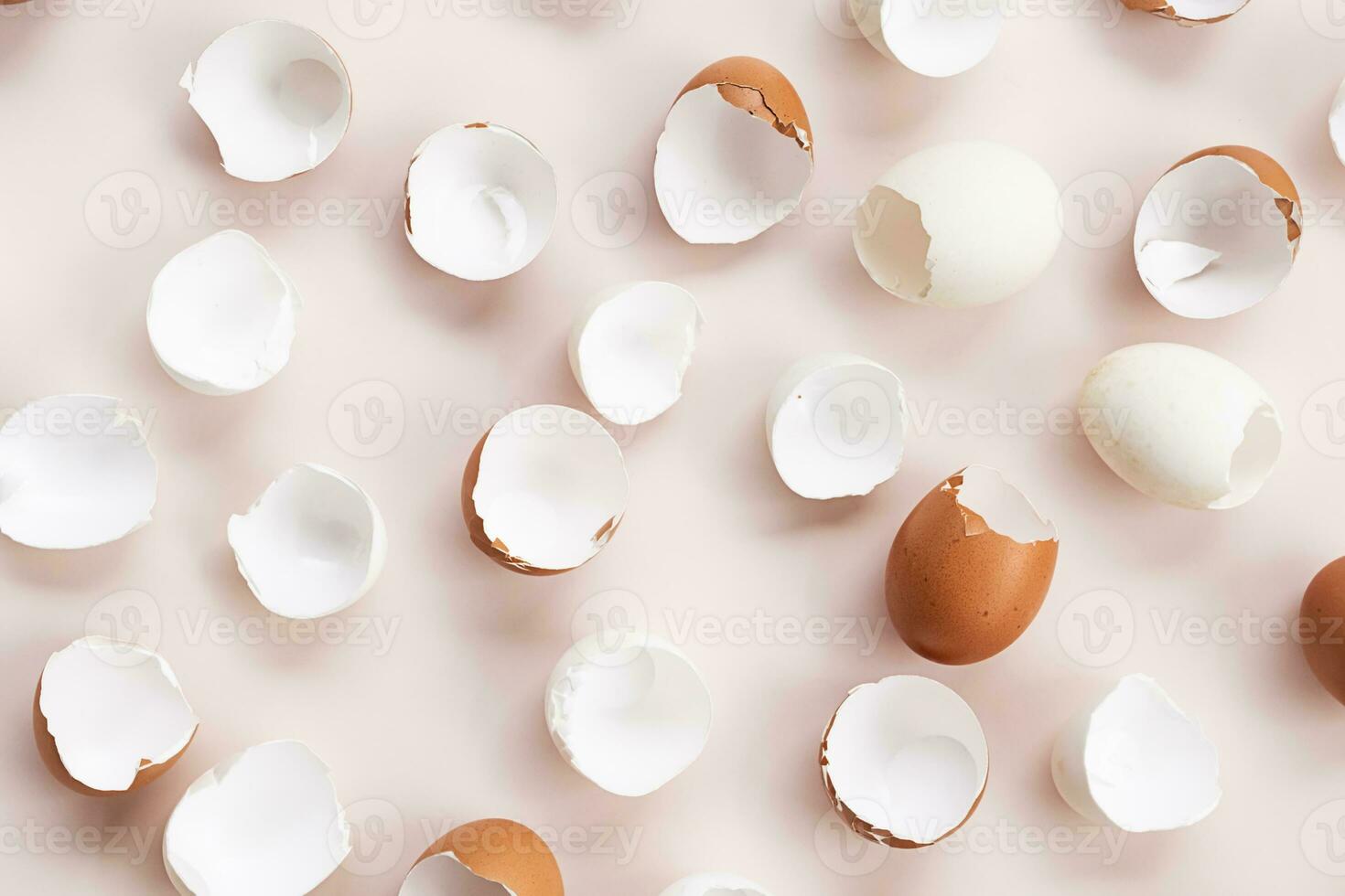 Springtime easter layout. Empty broken chicken eggshells. Pro Photo