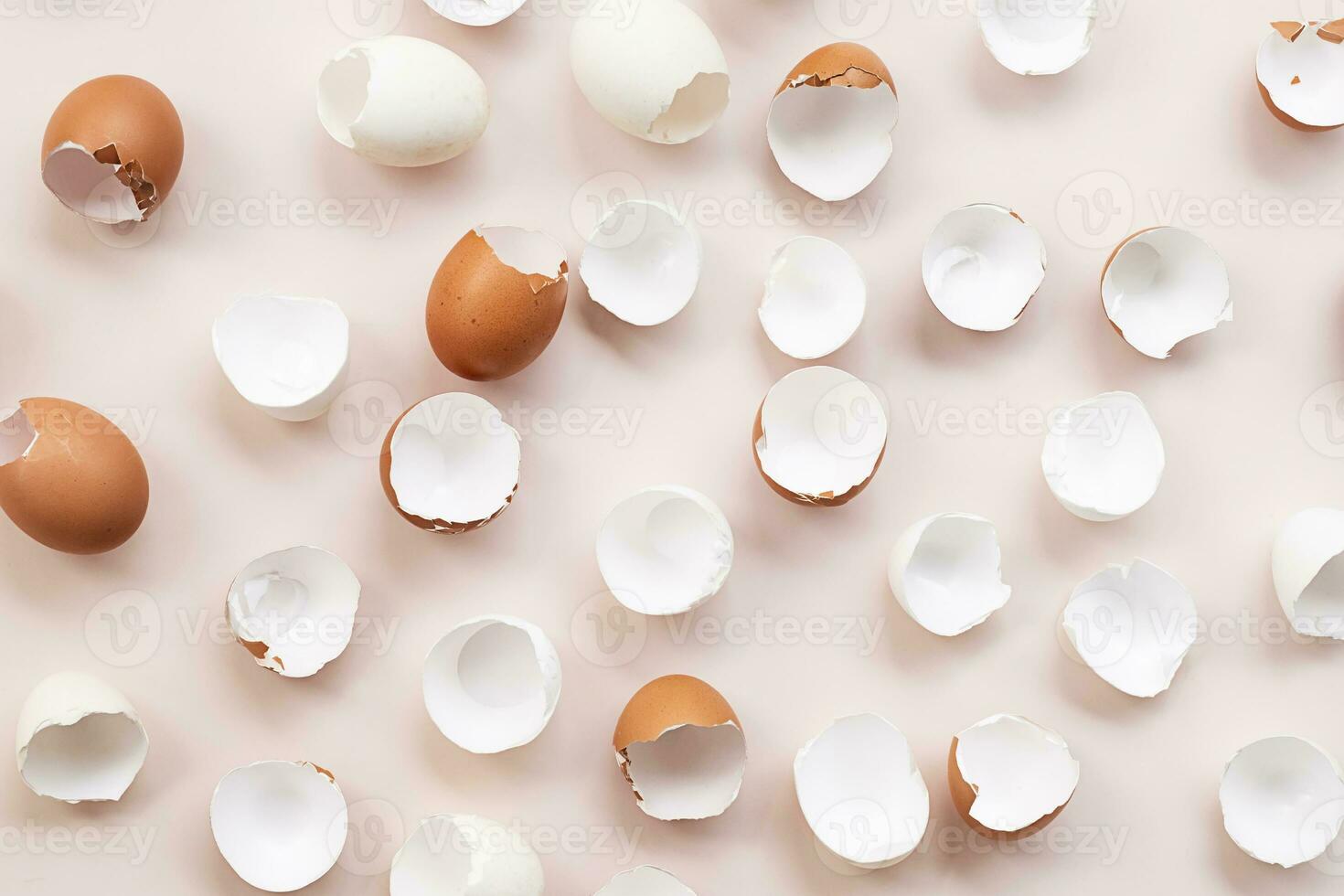Springtime easter layout. Empty broken chicken eggshells. Pro Photo