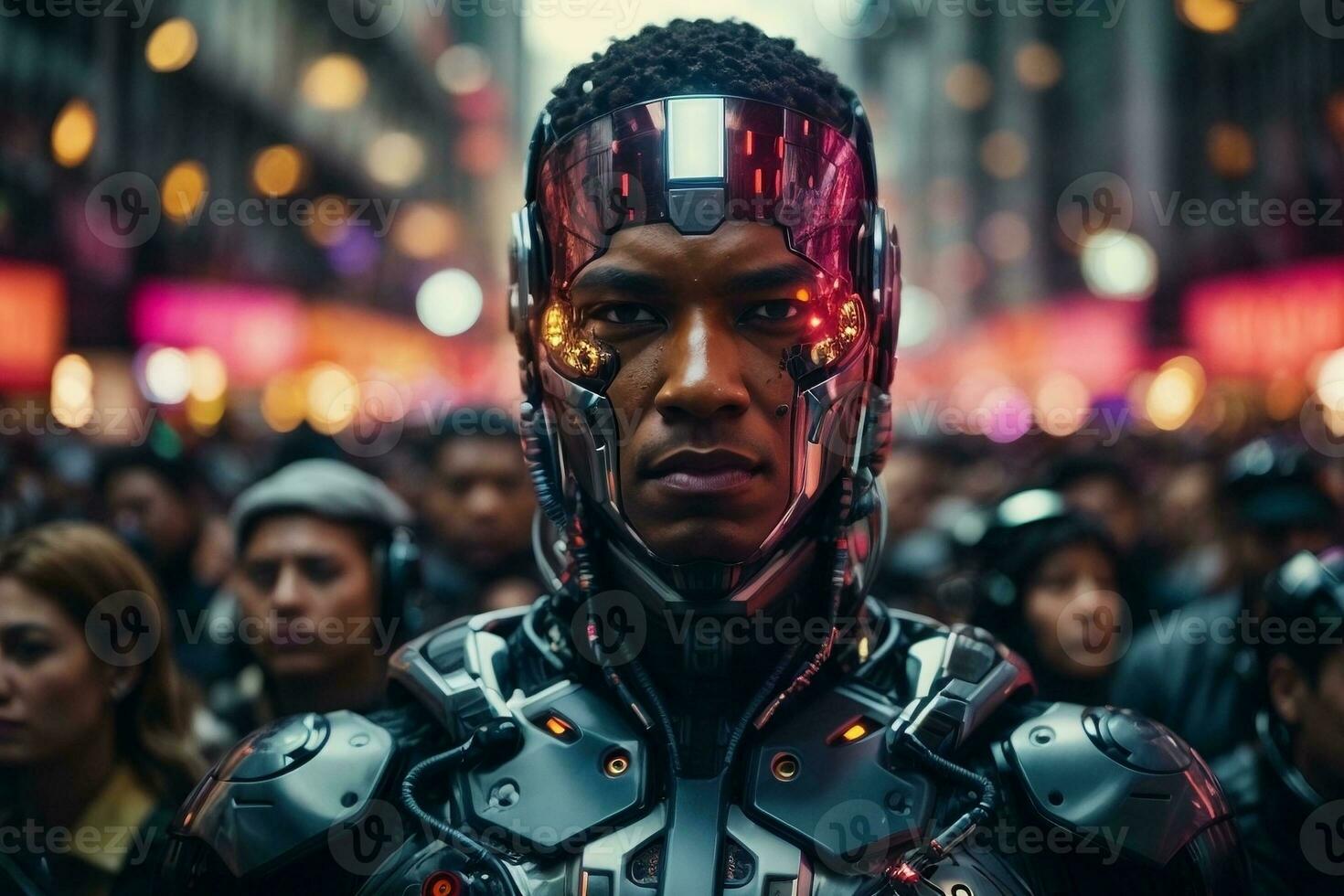 A dark-skinned android man against the background of the crowd and the city. The problem of artificial intelligence, the future, science fiction. AI Generative Pro Photo