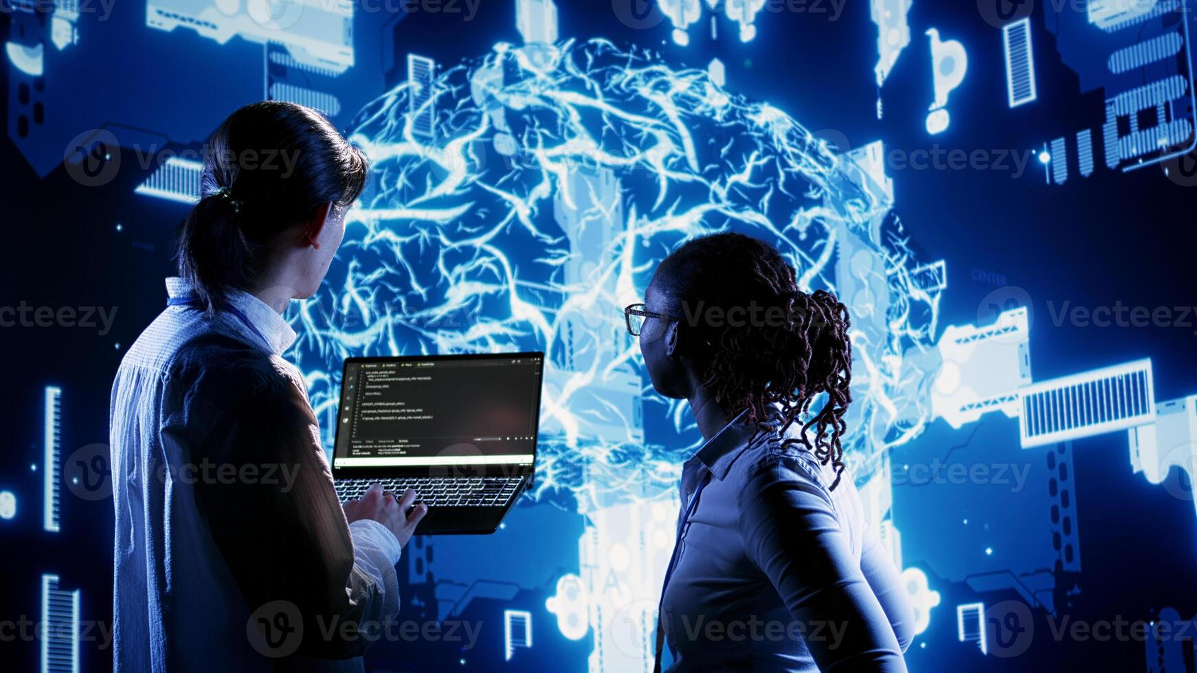 Proactive IT coworkers programming scripts on laptop, employing AI machine learning. Efficient colleagues manipulating lines of code for artificial intelligence applications development Pro Photo