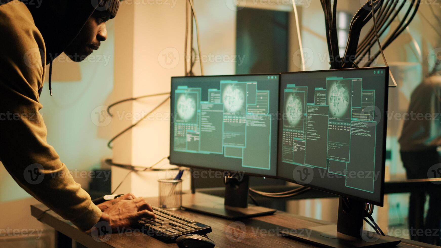 African american spy copying important data from hard disk, using drive to plant computer malware on multi monitors. Young adult hacking network system and security server, output source. Pro Photo