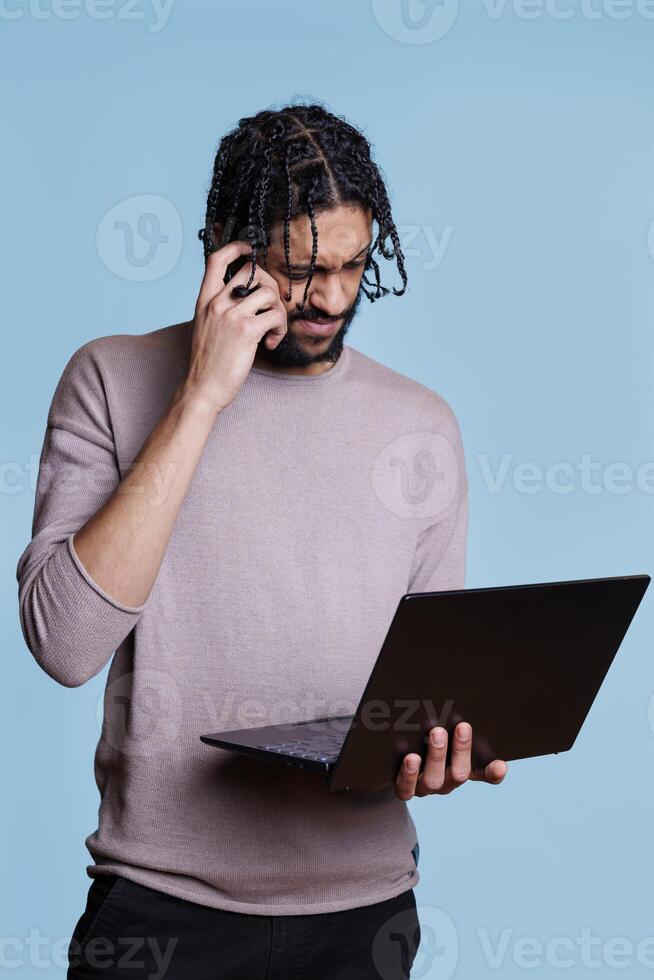 Puzzled arab programmer solving code problem on laptop and rubbing head. Young adult person with unsure facial expression holding portable computer and developing software Pro Photo