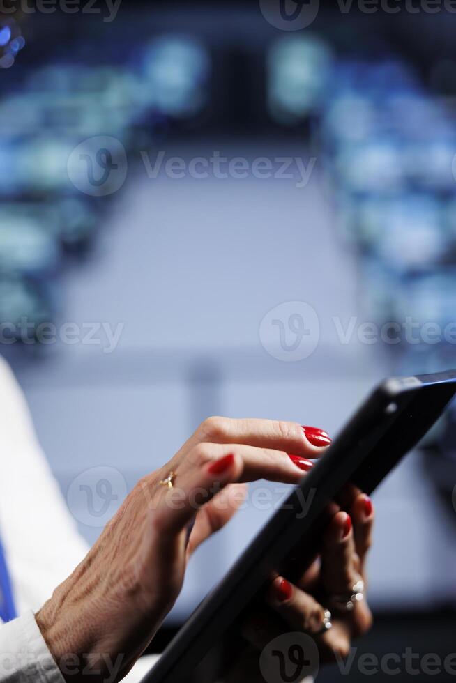 Capable admin using tablet to make sure data remains shielded from security hindrances, safeguarding cloud computing business servers against unauthorized access, close up Pro Photo