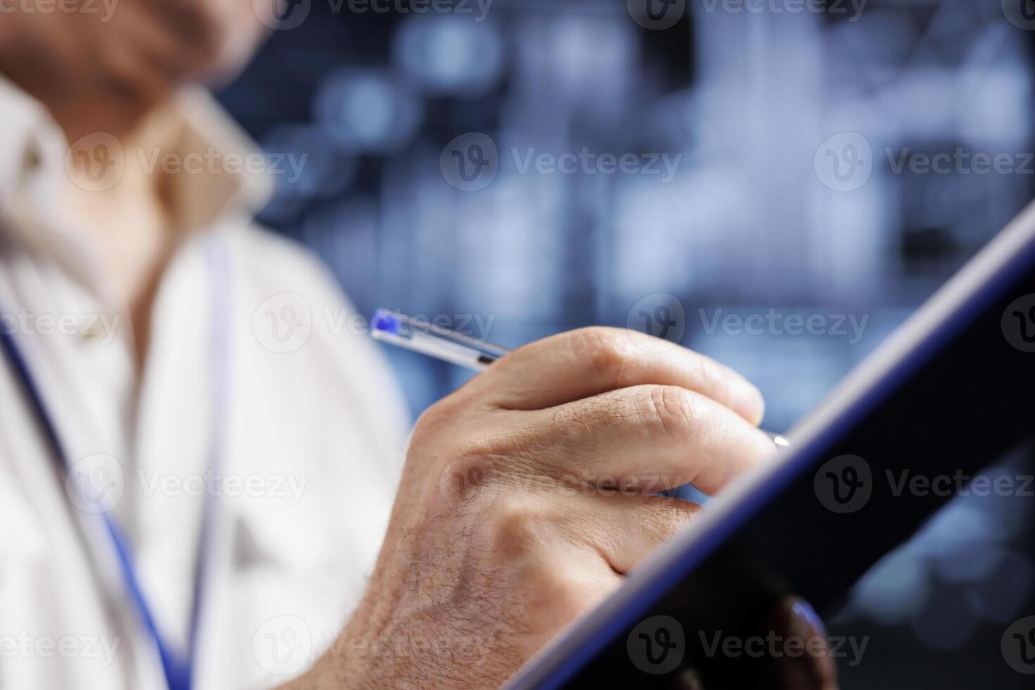 Experienced admin in crypto mining farm with specialized machines using Blockchain technology. Fintech supervisor holding clipboard, inspecting asic mainframes solving hashing operations, close up Pro Photo