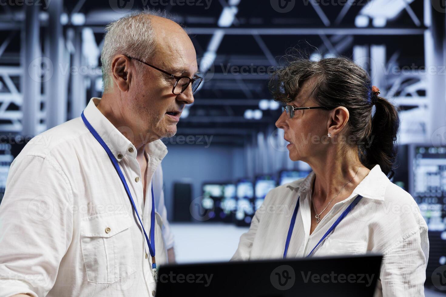 Elderly coworkers preventing strain on data center machines caused by AI applications driving up power usage. Teamworking colleagues maintenancing server clusters doing intense computations Pro Photo