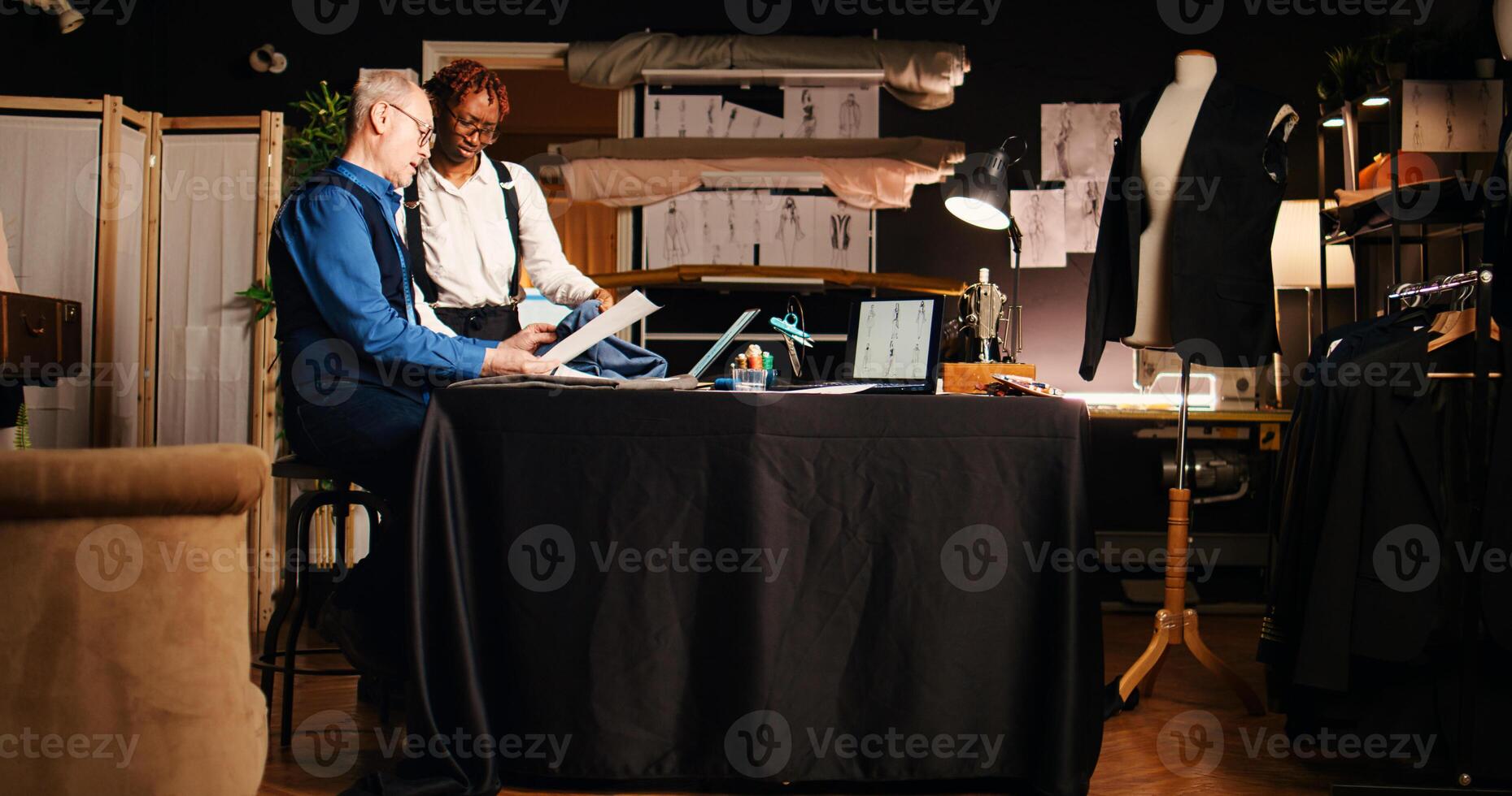 Tailor and student choosing design to create tailored clothes custom made, learning manufacturing process in atelier. Experienced craftsman teaching apprentice to design items. Handheld shot. Pro Photo