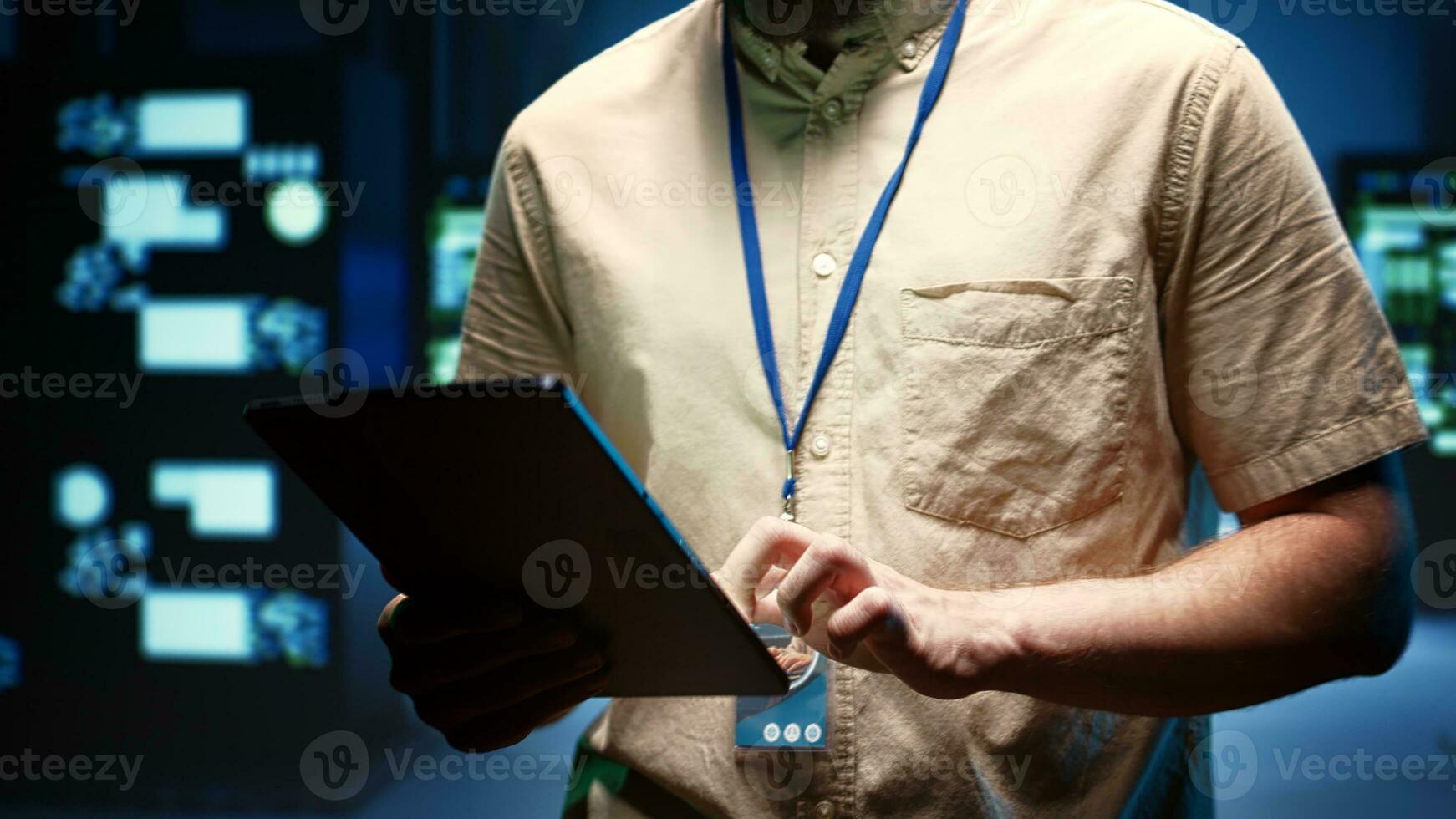 Engineer in data center setting up high bandwidth dedicated multiplayer online gaming servers to accommodate more traffic from worldwide locations, avoid disruptive lag times and low ping rates Pro Photo