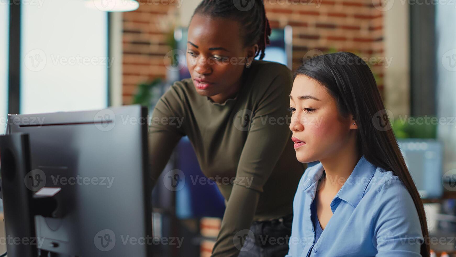 Multiethnic team of IT developers working on computers to create artistic machinery software, using 3d interface. Engineering experts analyzing infographics to create project in agency studio. Pro Photo
