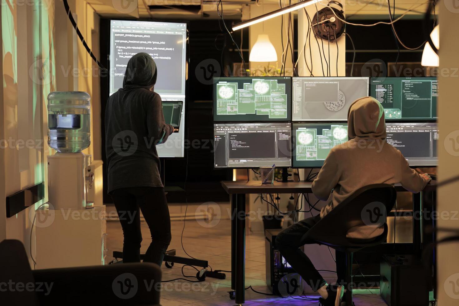 Spies working in team to break into government sensitive network, planting virus and attacking database on multiple monitors. Young hackers acting dangerous hacking system at night. Pro Photo