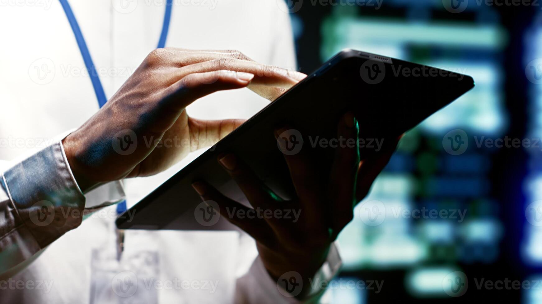 Close up shot of mechanic using tablet to find flaws in data center components doing complex calculations, processing massive datasets for machine learning and AI applications. Pro Photo