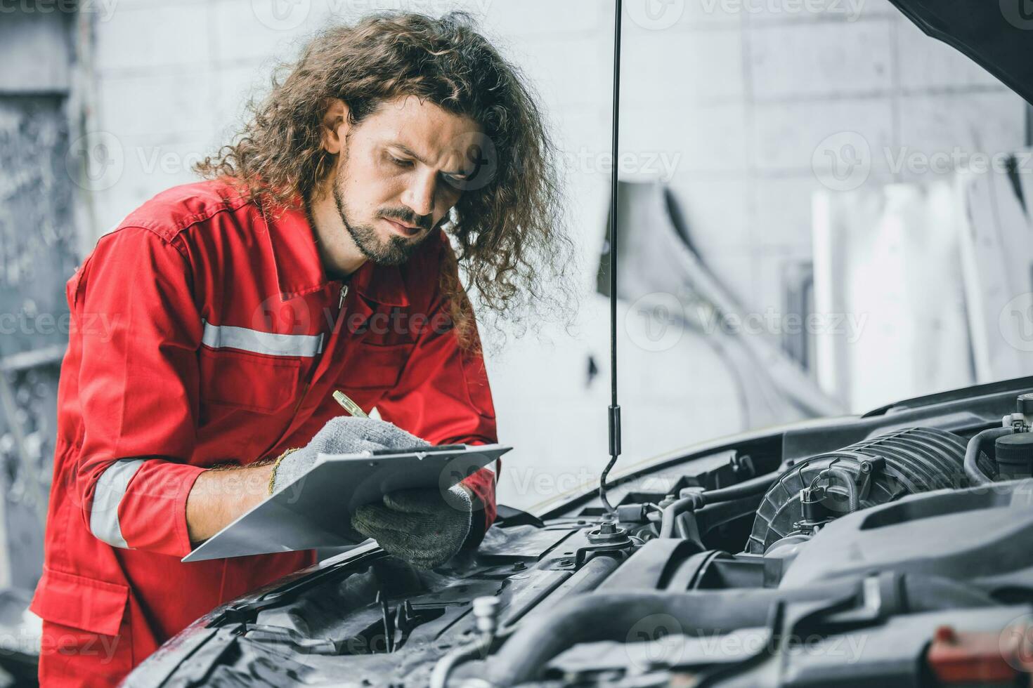 Mechanic male team staff worker working with car problem engine auto service check replace part list in garage Pro Photo
