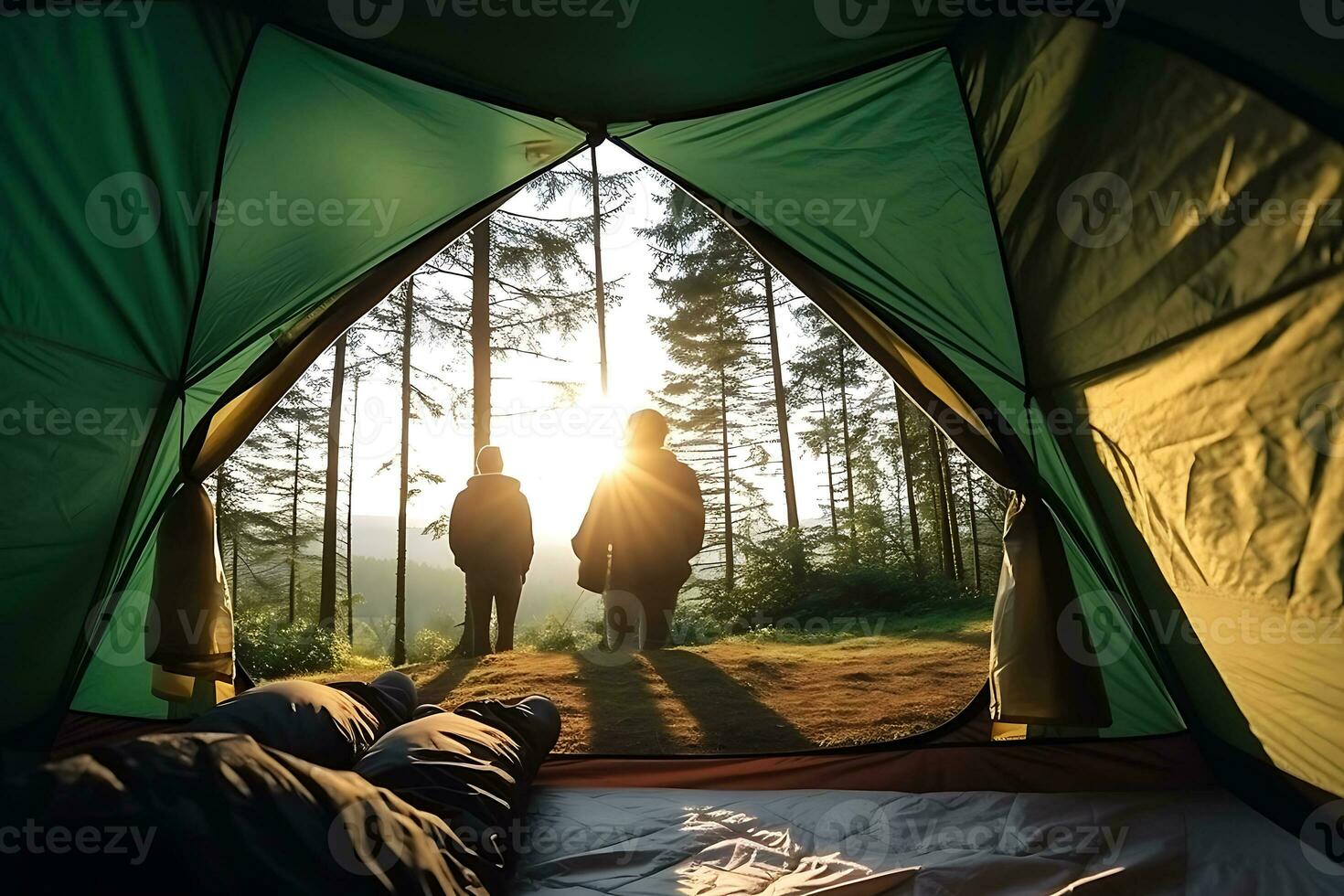 Weekend with a tent in the forest. A man and a woman are walking and enjoying the view of nature. View from the back, inside the tent. AI Generative Pro Photo