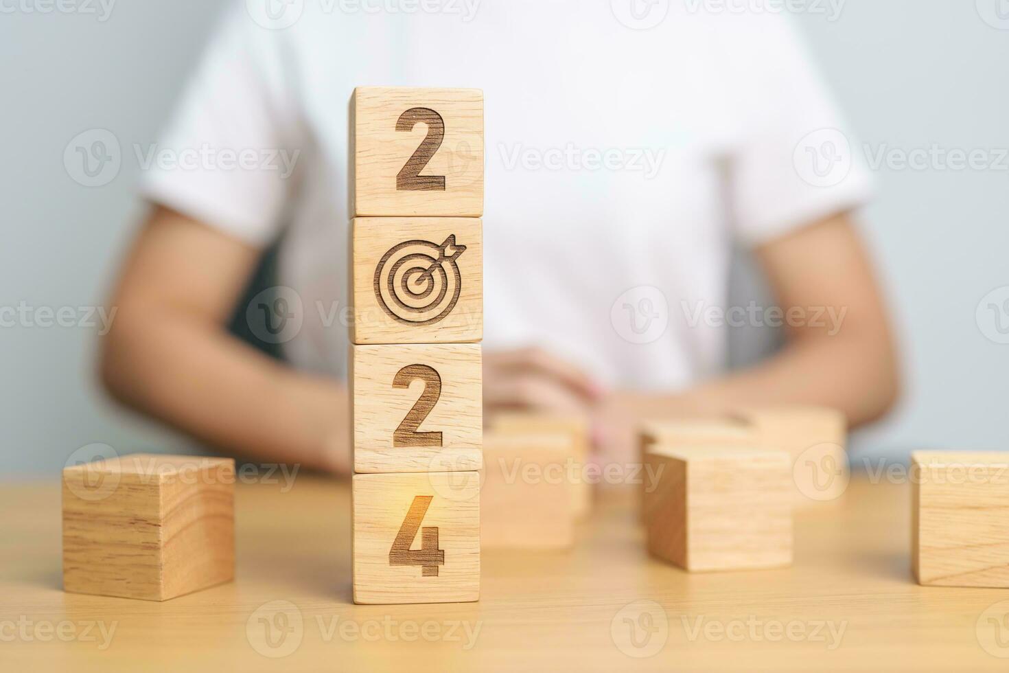 2024 block with dartboard sign. Business Goal, Target, Resolution, strategy, plan, Action motivation, mission, thinking, and New Year start concepts Pro Photo
