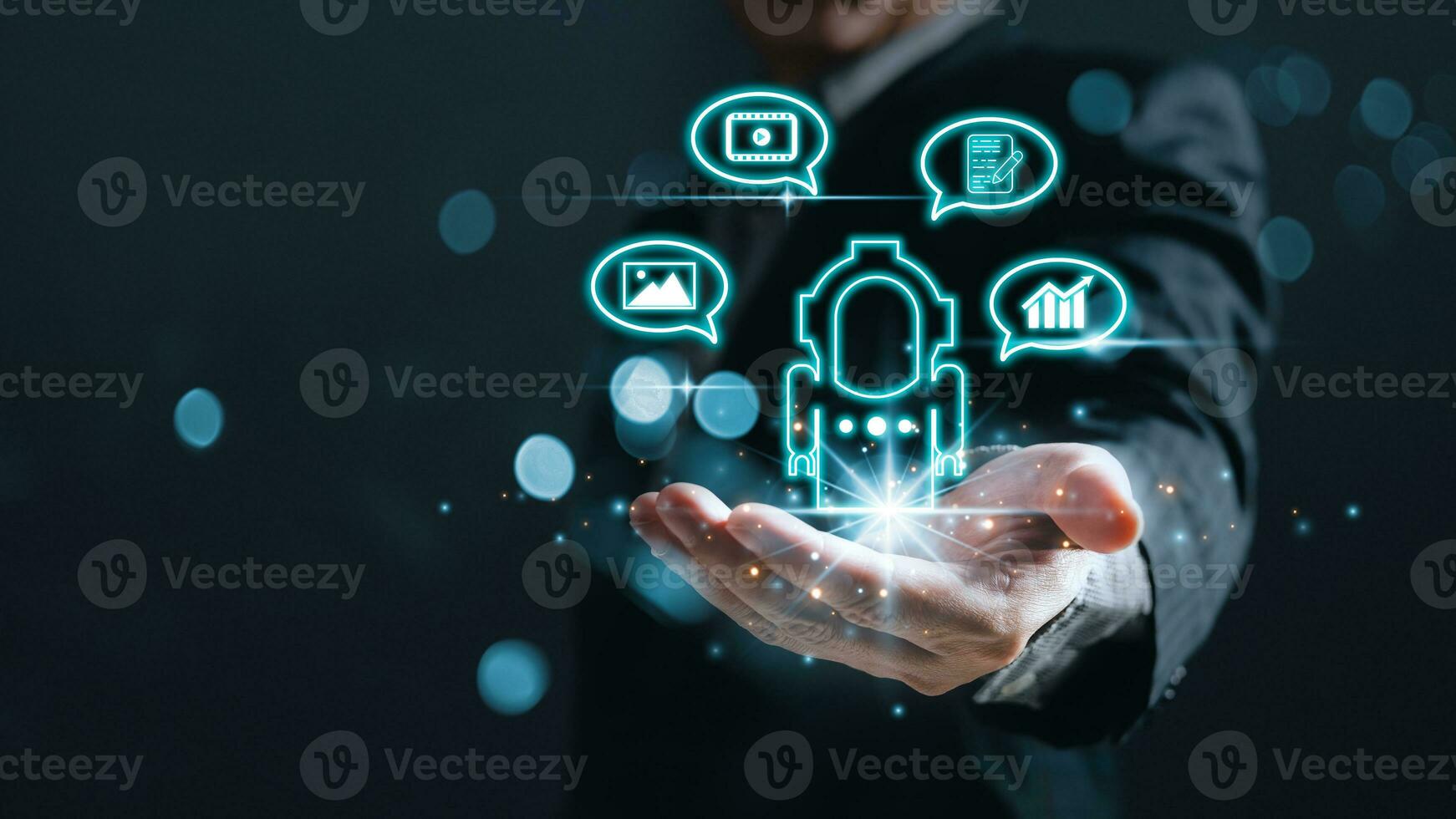 man hold bot icon and command prompt ai chat ability to create photos,compose song and novels,make videos,stock trading,ai disruption in many professions.Digital Artificial Intelligence AI technology Pro Photo