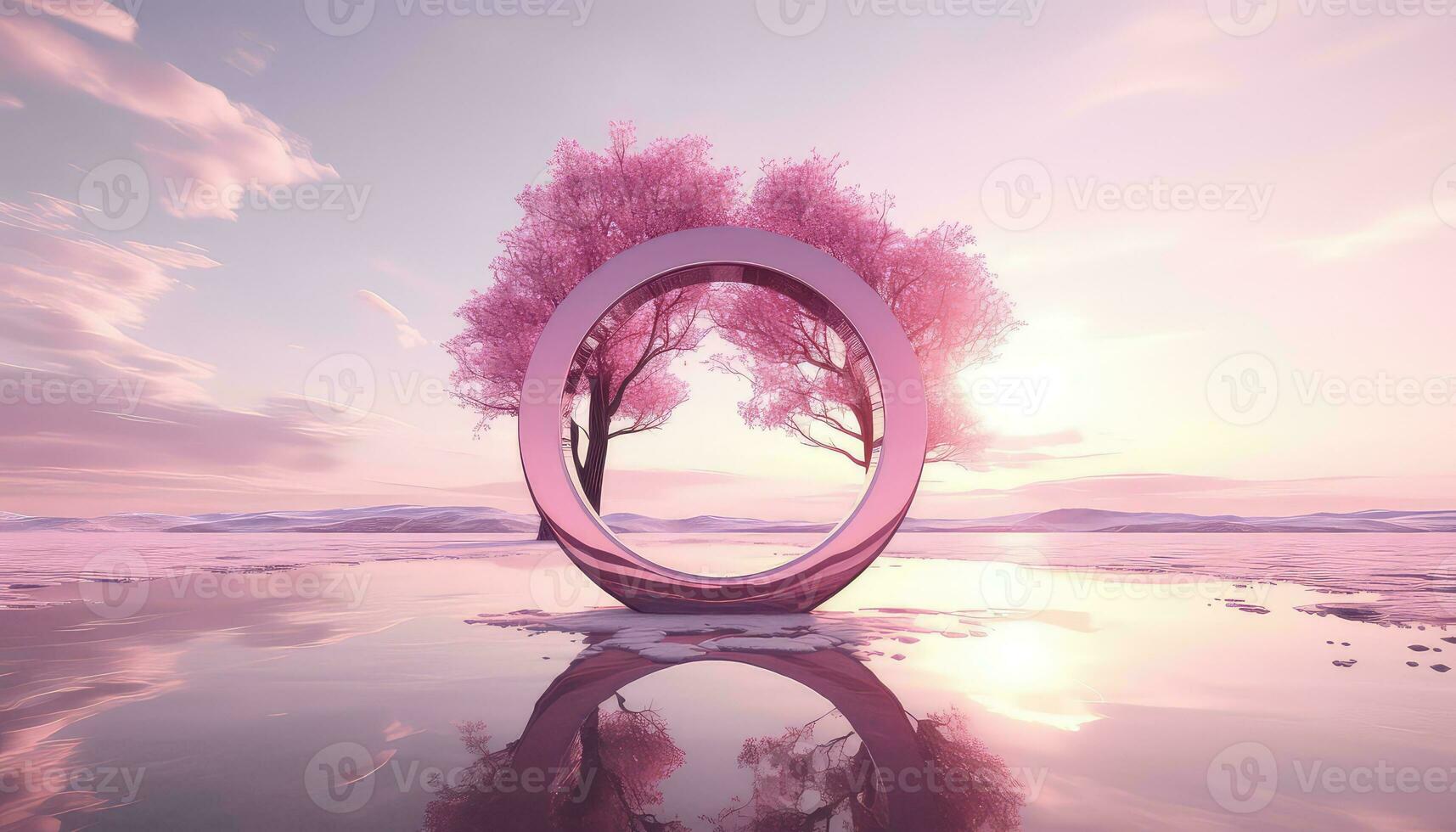 Hyperrealistic Pink Clouds and Trees The Large Circular Structure AI generated Pro Photo