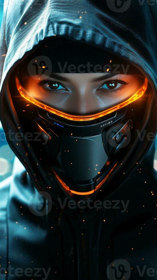amazing futuristic ninja portrait with space for text, background image, vertical format, generative AI Pro Photo