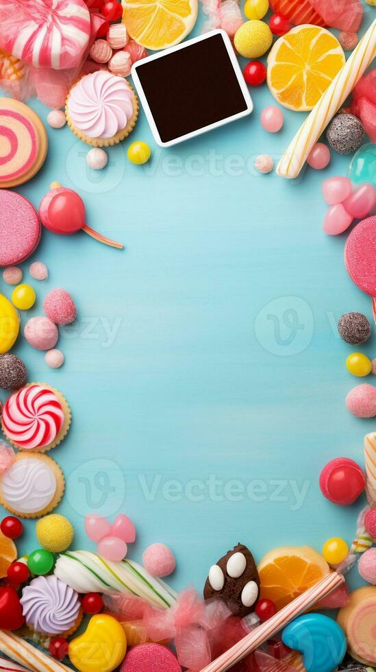 Textured background surrounded by sweets and candies from top view, background image, vertical format, generative A Pro Photo