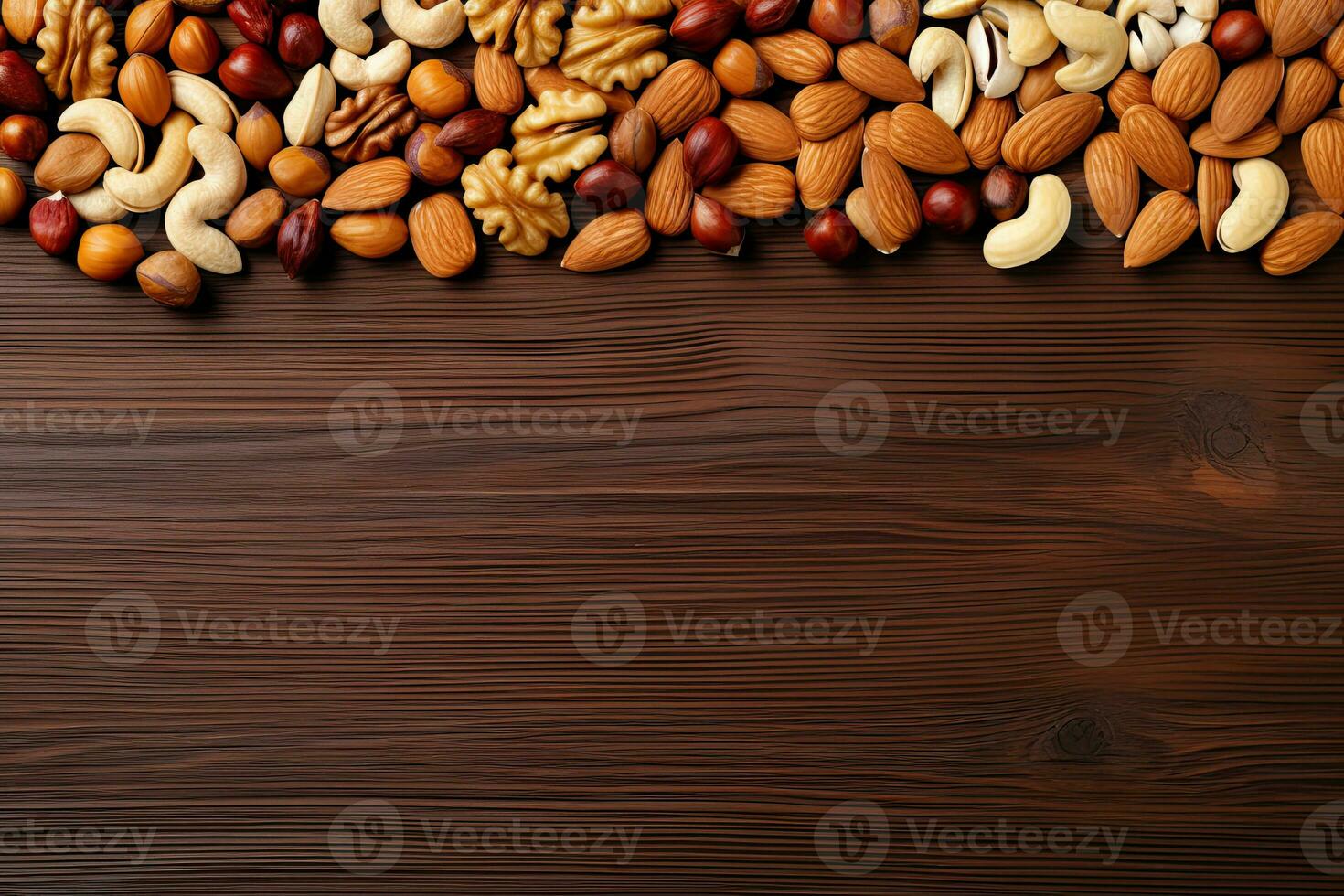 Almond nuts on wooden background. Top view with copy space. Generative AI Pro Photo