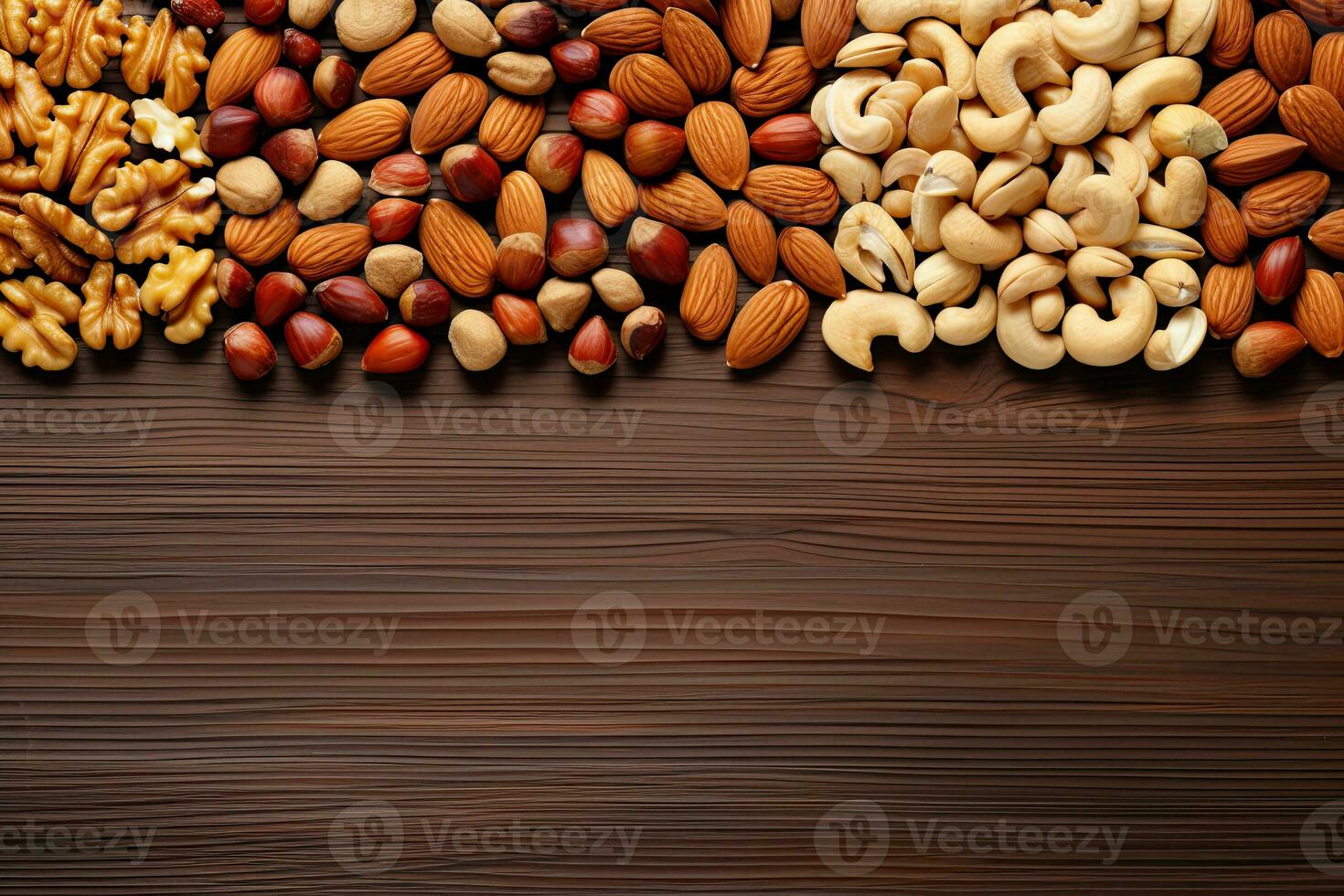 Almond nuts on wooden background. Top view with copy space. Generative AI Pro Photo