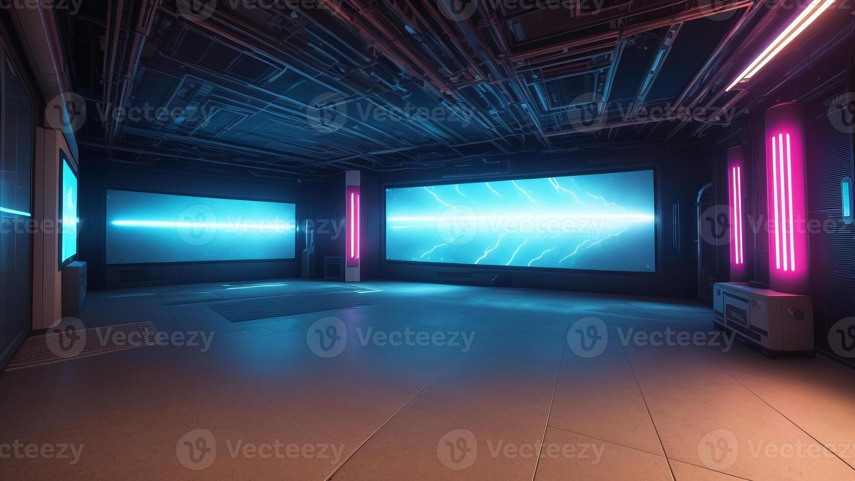 Cyberpunk sci fi product podium showcase in empty spaceship room with blue and pink background. Pro Photo