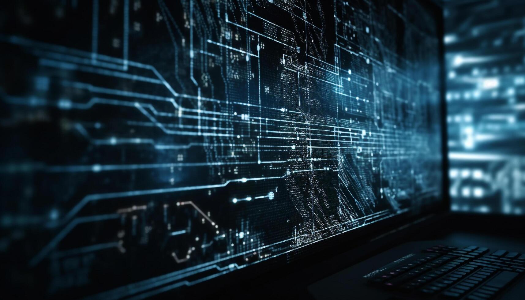 Futuristic computer network glows with abstract patterns generated by AI photo