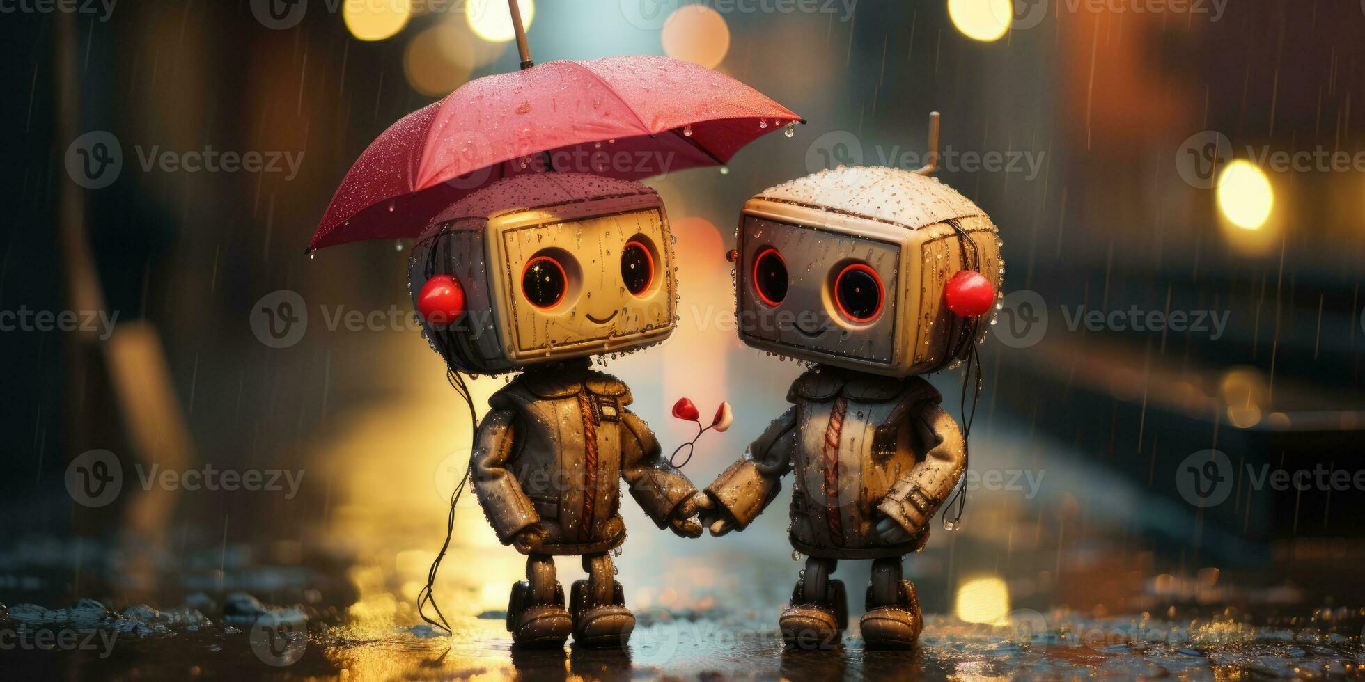Robots in love in cyberspace city in a rain Generative AI Pro Photo
