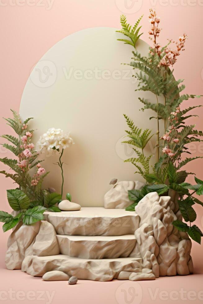 3D rendering of a round podium with colorful flowers. The podium is made of wood and has a smooth surface. The flowers are arranged in a spiral pattern, creating a beautiful display. AI Generative Pro Photo
