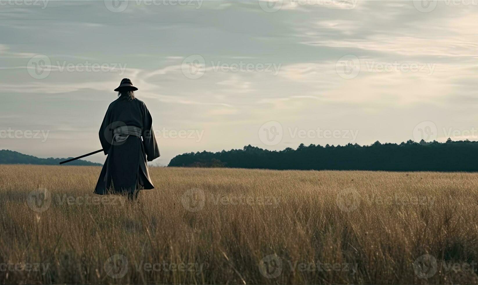 The silent samurai and his lethal katana in the field Creating using generative AI tools Pro Photo