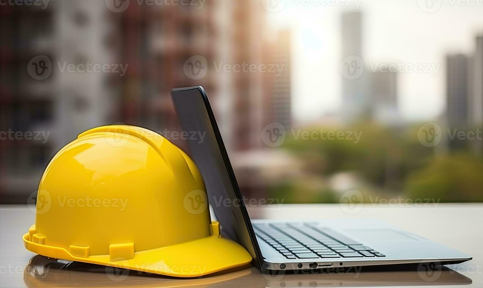 Hard hat and safety equipment on desk with construction plans. Creating using generative AI tools Pro Photo