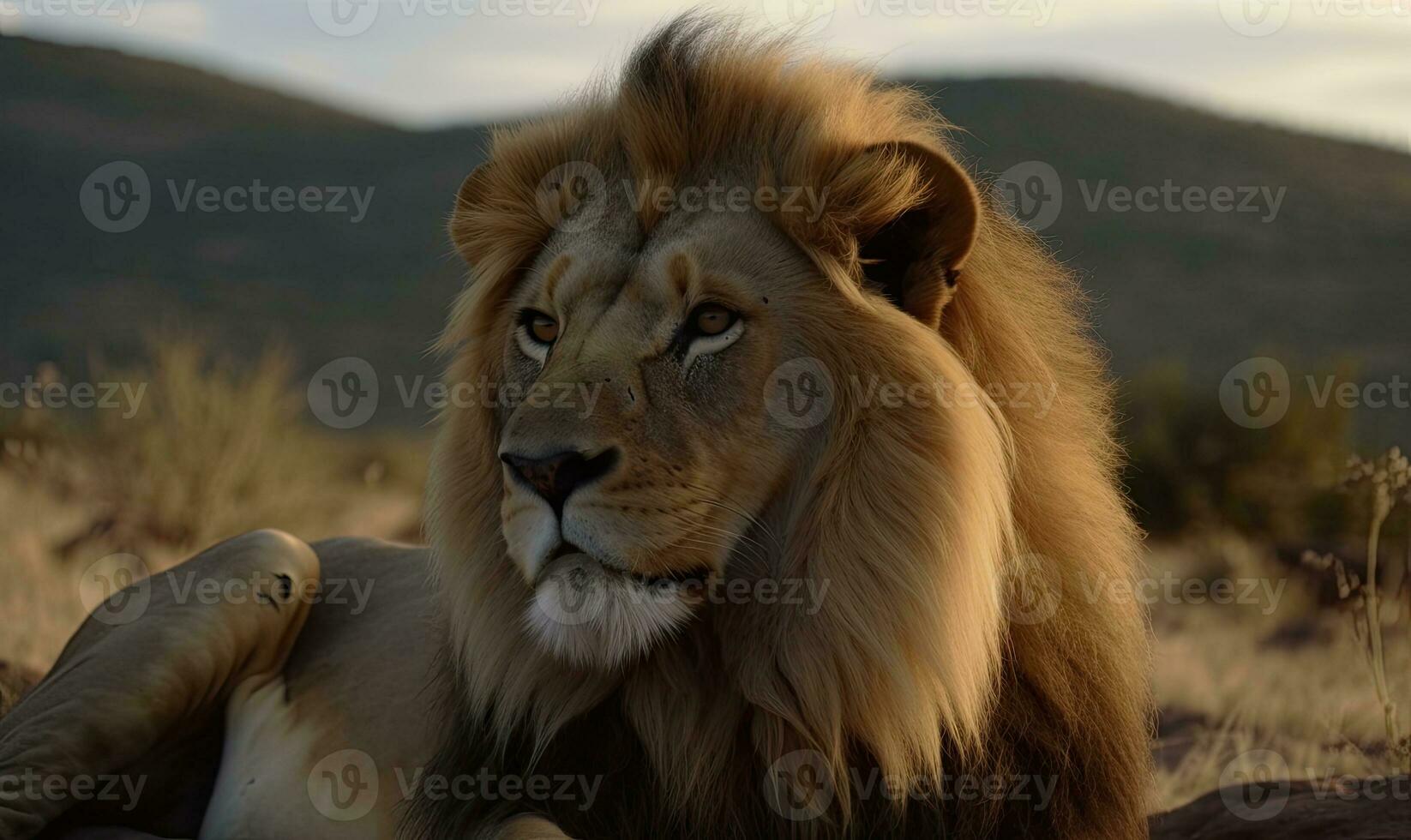 The old lion lies alone on the hill Creating using generative AI tools Pro Photo