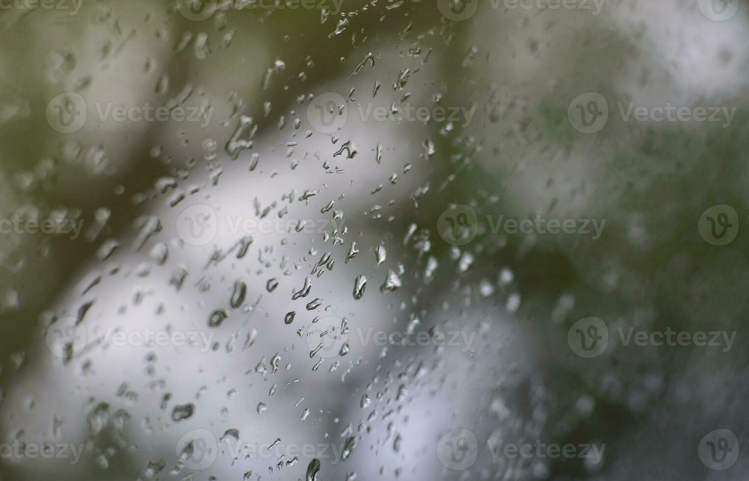 A photo of rain drops on the window glass with a blurred view of the blossoming green trees. Abstract image showing cloudy and rainy weather conditions Pro Photo