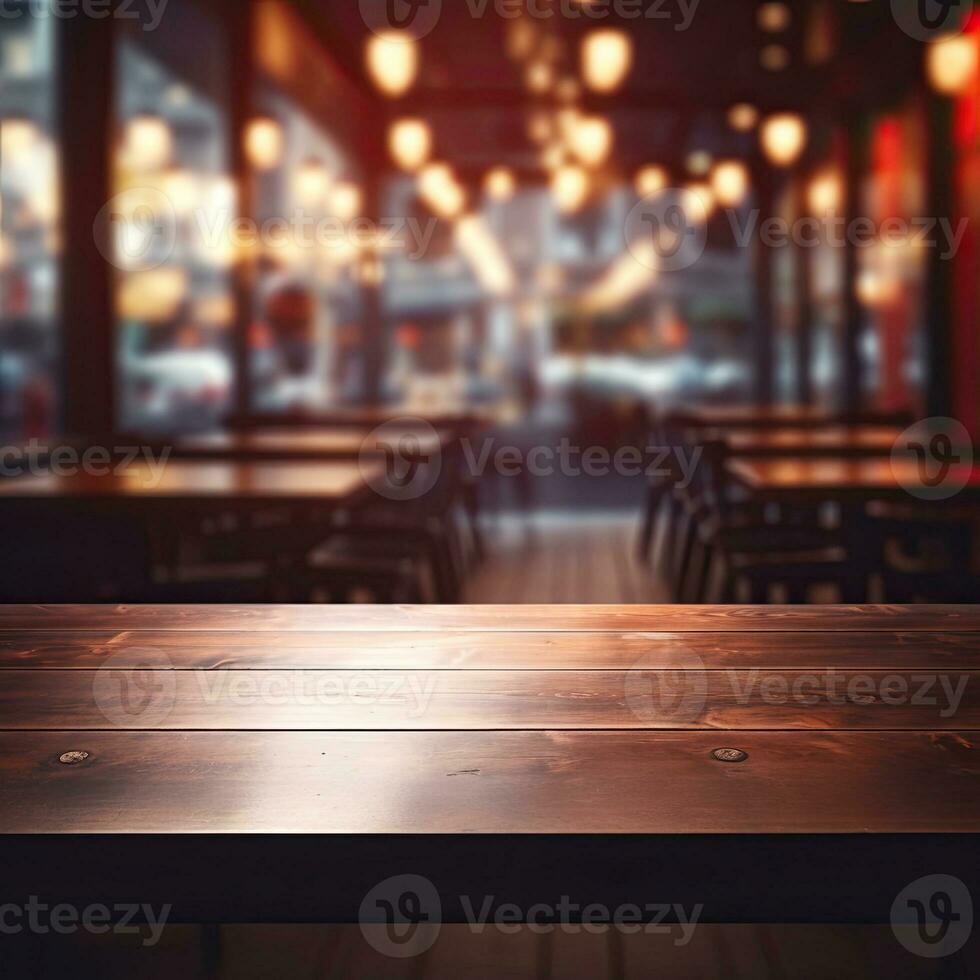 Dark empty wooden table and blurred cafe background front view ai generative Pro Photo