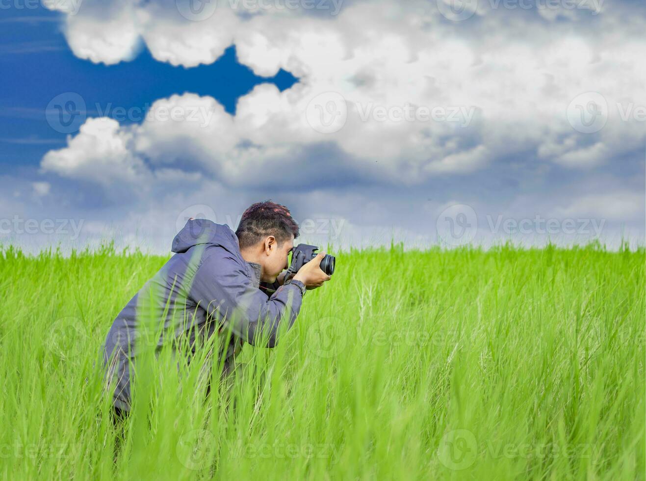 Man taking picture with camera in the field, photographer in the field taking a picture, Latino man in a green field taking a picture Pro Photo