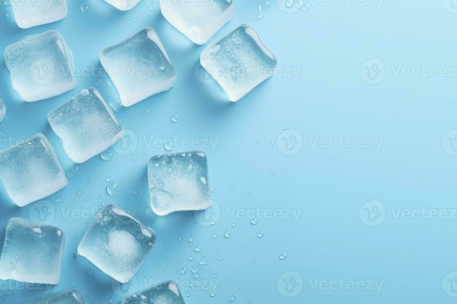 Cubes of ice and drops are isolated on the blue background with empty space. AI Generated Pro Photo