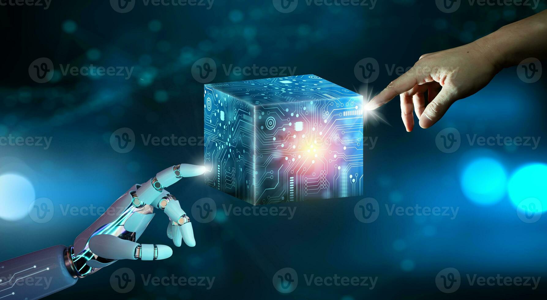 Ai Robot hand and Businessman hand pointing Cube technology. Cloud data with Artificial Intelligence. Pro Photo