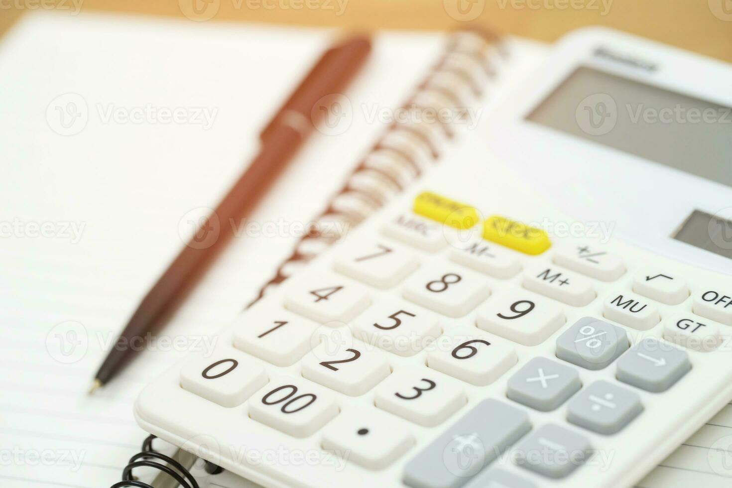 Money calculator and notebook,notepad,pen on wood table, top view with copy space - financial background concept Pro Photo