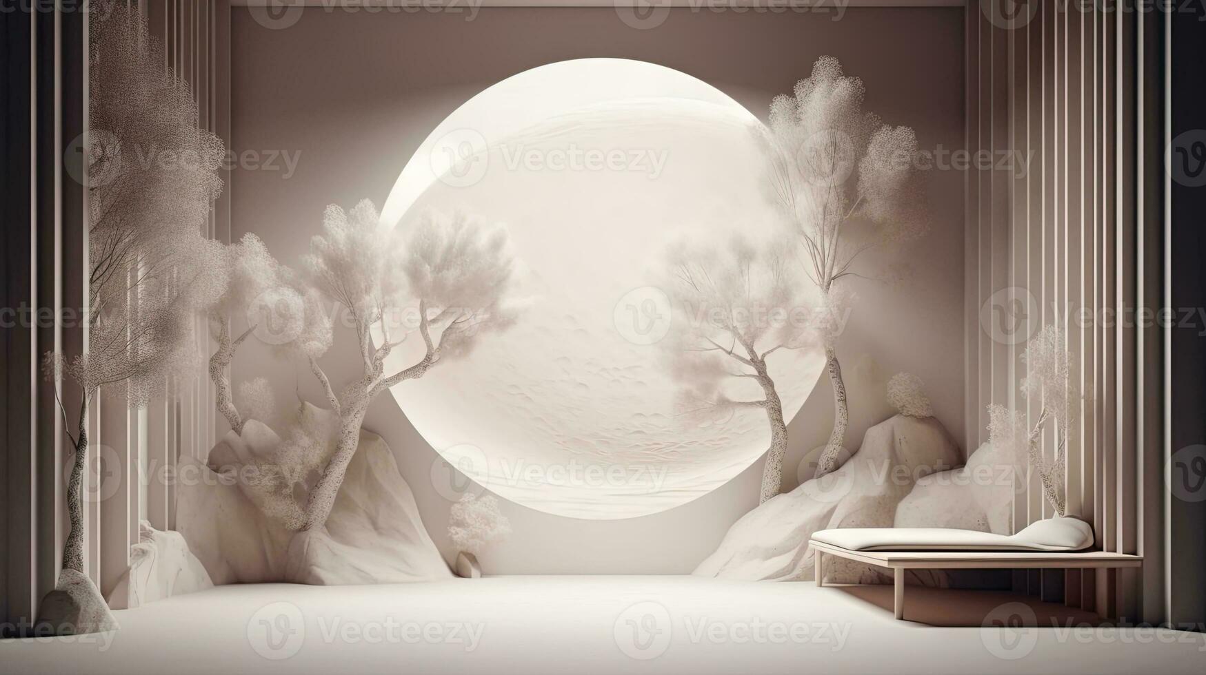 Interior with circular architecture form in 3D style. Abstract room with arc element and trees. Generated AI. Pro Photo
