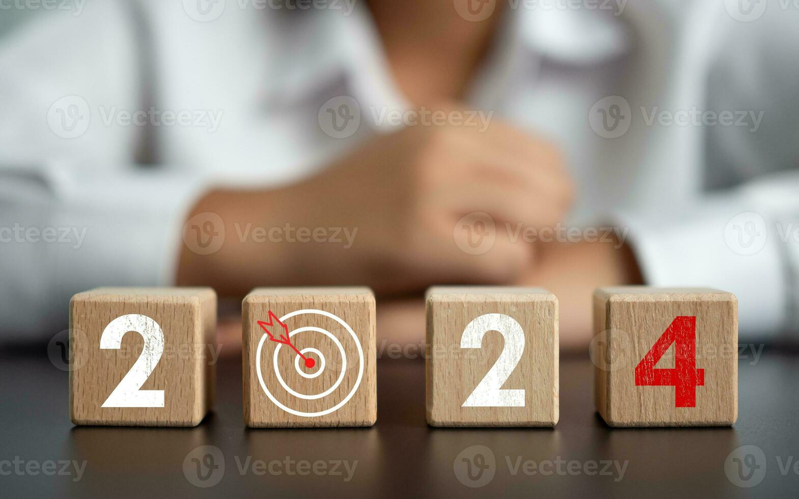 wooden blocks lined with year letters 2024 with a dart board and a businessman in the background It is considered to be setting goals for 2024 and is an idea for starting to set business goals. Pro Photo