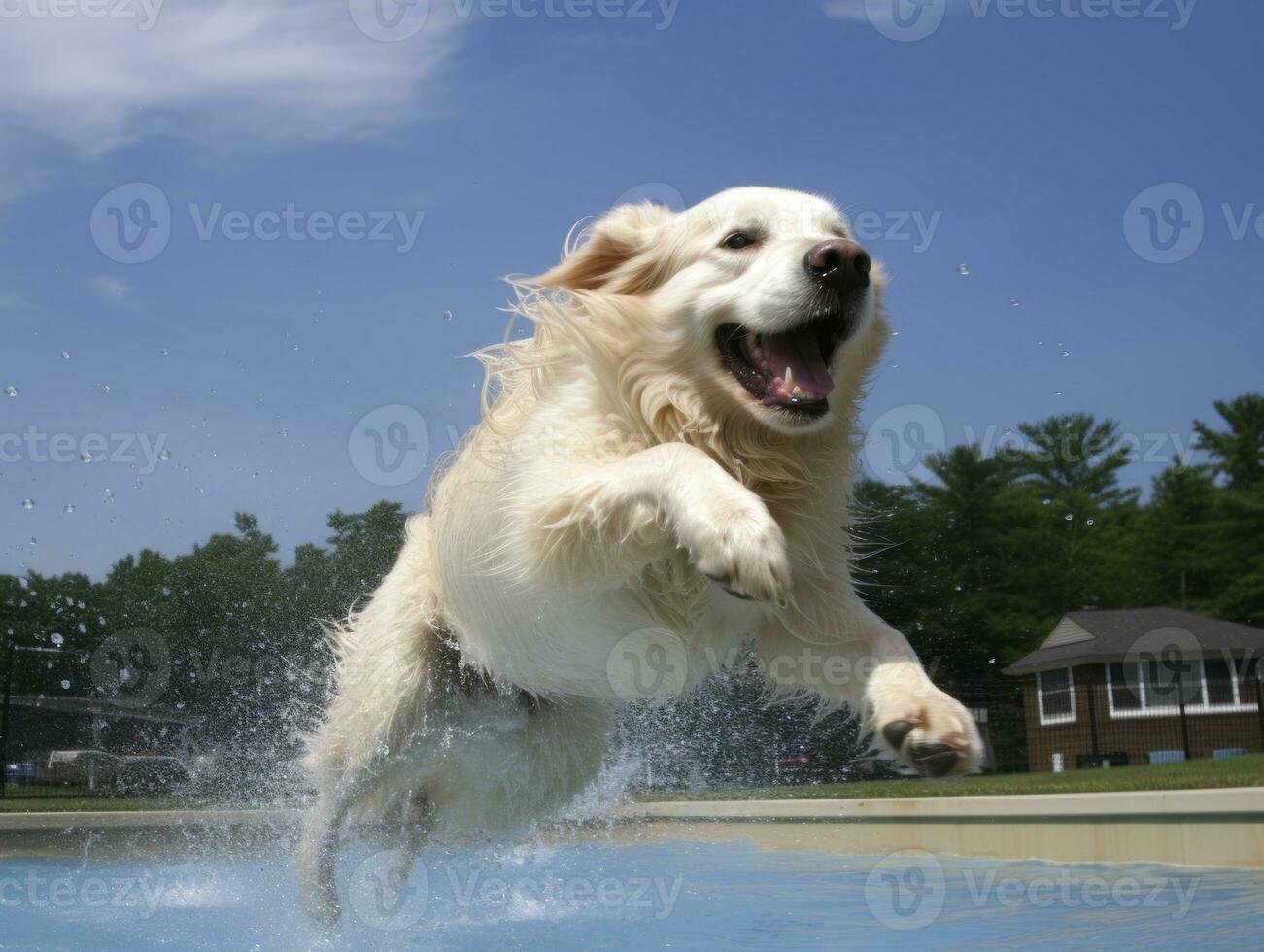 Wet and joyful dog leaping into a pool on a hot summer day AI Generative Pro Photo