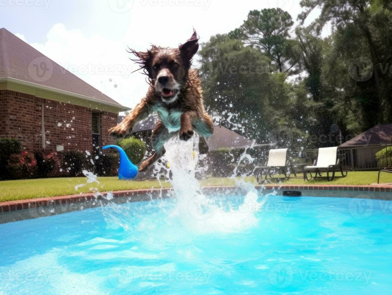 Wet and joyful dog leaping into a pool on a hot summer day AI Generative Pro Photo