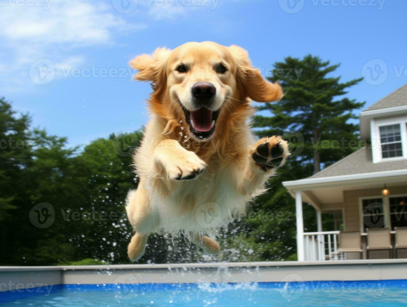 Wet and joyful dog leaping into a pool on a hot summer day AI Generative Pro Photo