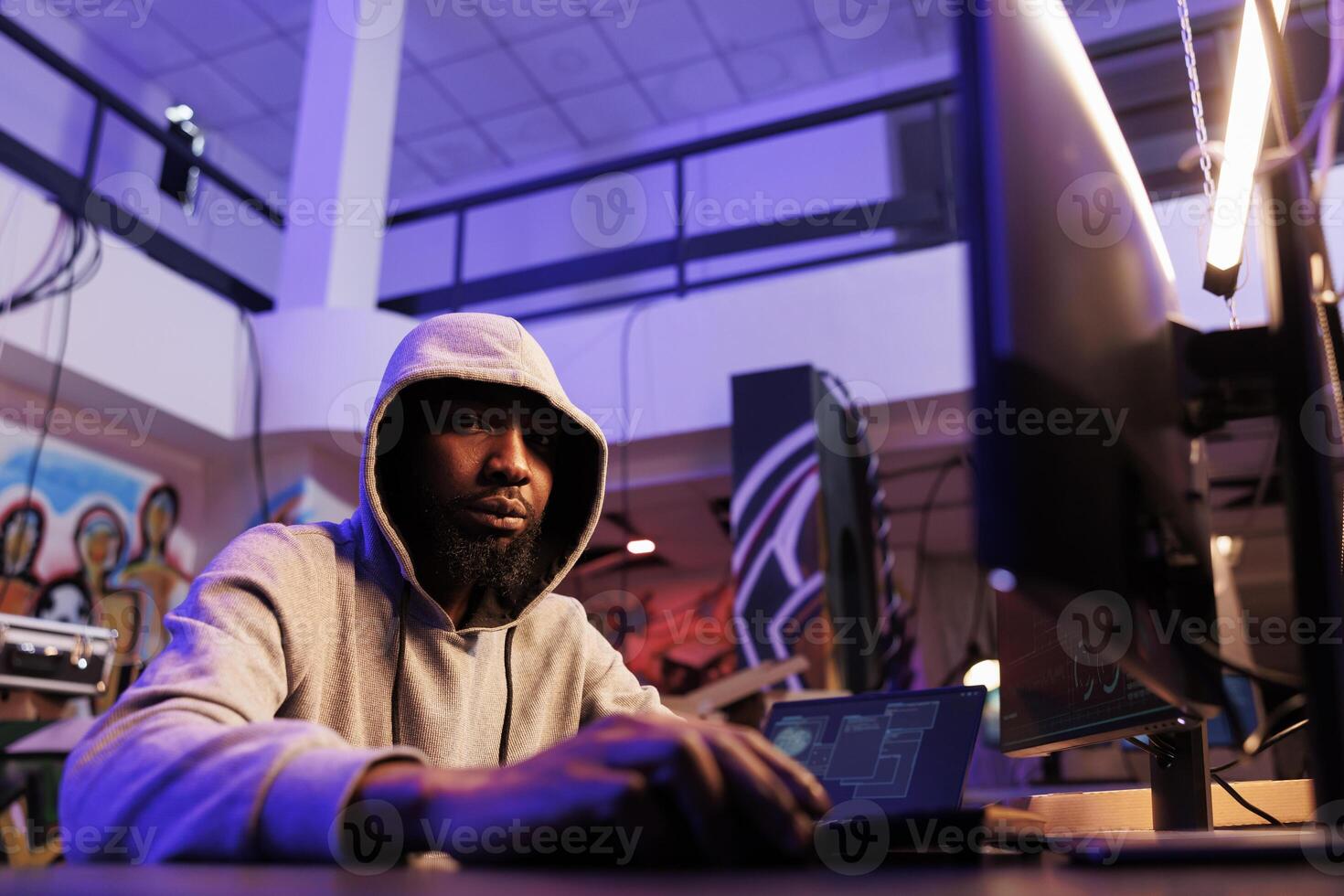 Hacker coding internet virus malicious software on computer portrait. African american man in hood doing ddos attack illegal activity and breaking law while looking at camera Pro Photo