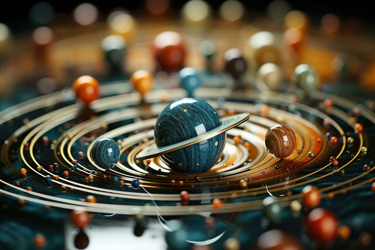 Round blue model of a planet with rings in its orbit. Abstract image of a planet in orbit. Generated by artificial intelligence Free Photo