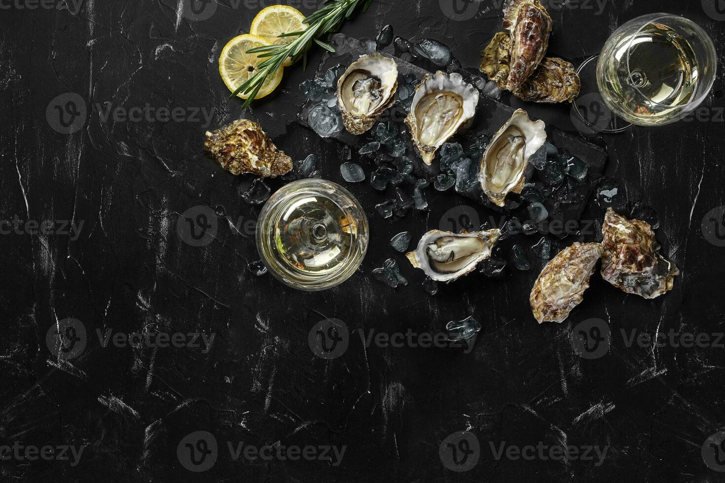 Fresh opened oysters, ice, lemon on a rectangle slate and champagne are on a black stone textured background. Top view with copy space. Close-up. Pro Photo