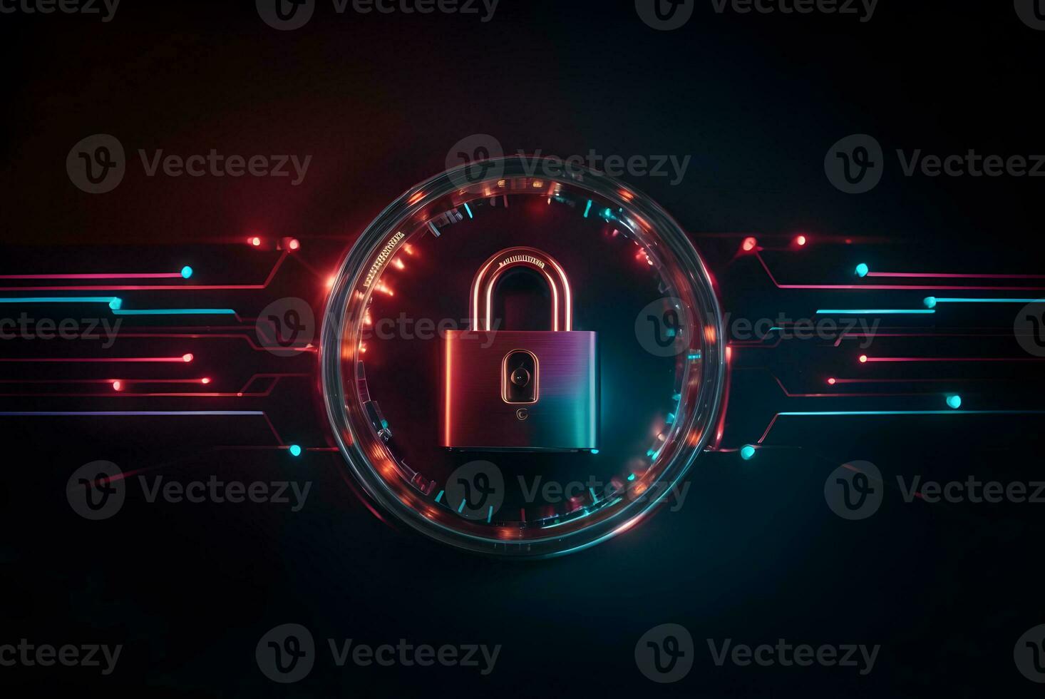 Lock with circuit pattern. Concept of data security, cybersecurity, cyber defense. Pro Photo