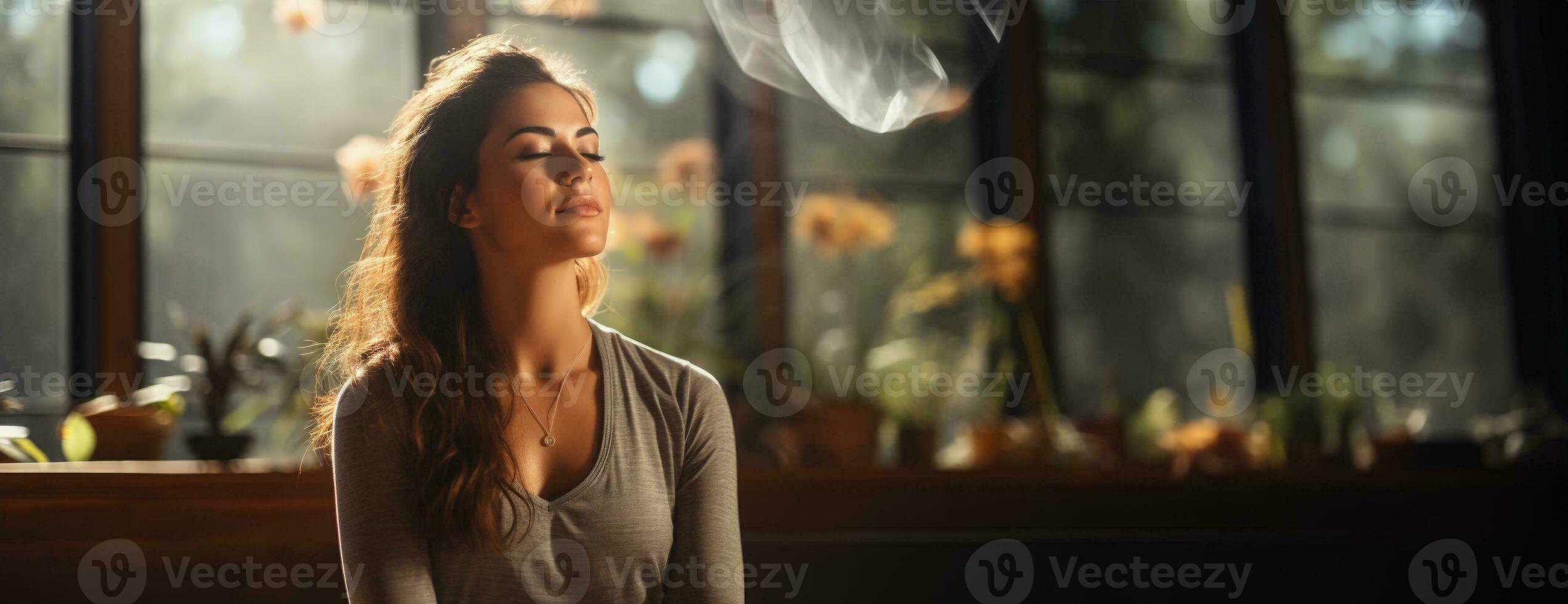 Deep inhale and exhale in yoga class background with empty space for text Pro Photo
